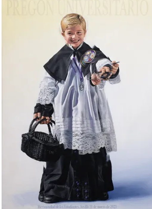 Monaguillo ofrece una estampa del Cristo de la Buena Muerte. Es la composición elegida por el pintor Sevillano para plasmar el cartel universitario de la Semana Santa de Sevilla de 2023.