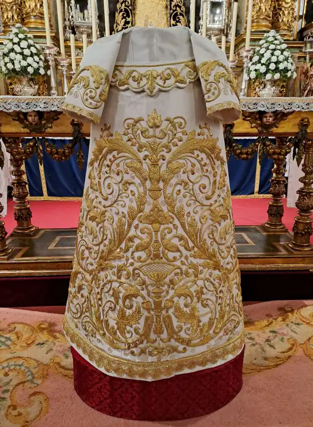 La magnífica pieza de bordado ha sido elaborada en el taller de Mariano Martín Santonja, siguiendo un exquisito diseño concebido por José María Carrasco Salas. La confección de la saya ha sido llevada a cabo por la prestigiosa Casa Farinós de Valencia, reconocida por su maestría en la creación de prendas litúrgicas.