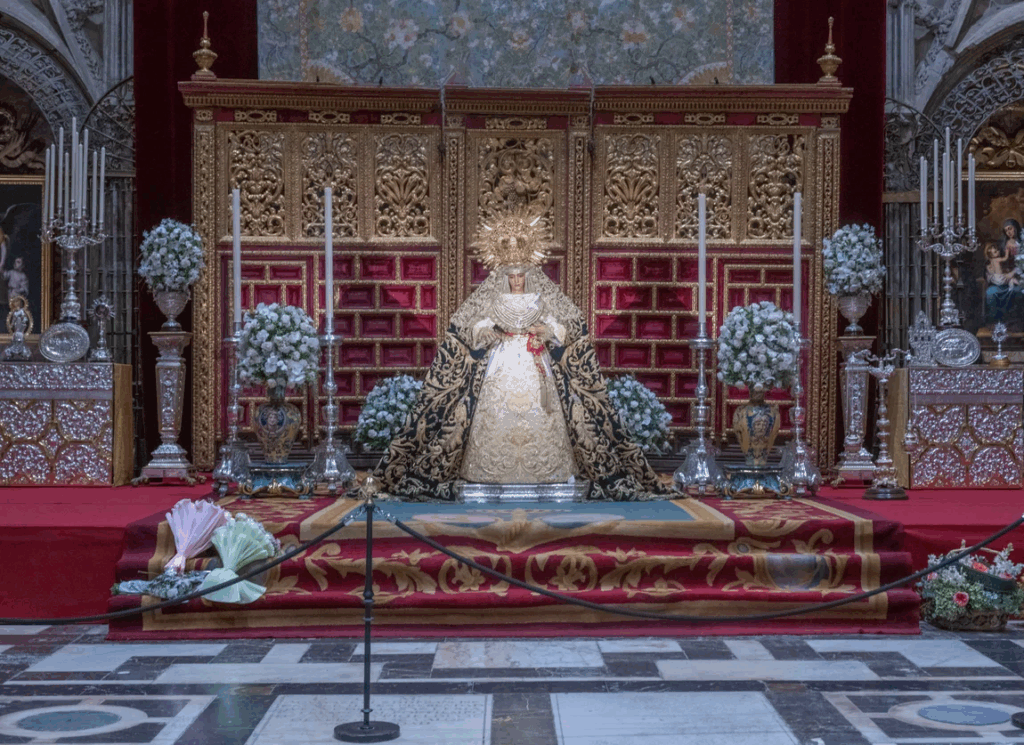 La imagen se alza frente al trascoro, justo donde reposa la Virgen de los Reyes, Patrona de Sevilla y de su Archidiócesis, creando un encuentro celestial entre dos reinas coronadas. Tras su traslado procesional desde la parroquia de San Jacinto, la Virgen ha sido dispuesta en un altar de besamanos digno de palacio real, rodeada de blancas flores que perfuman el recinto y velas encendidas que tiemblan al paso de los fieles.
