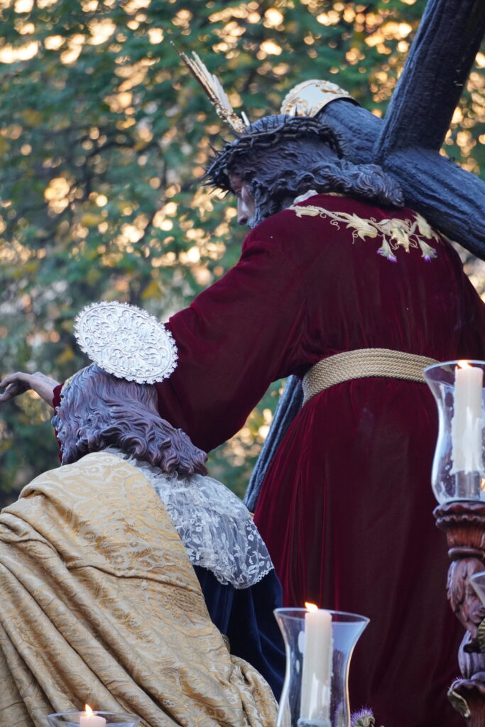 La jornada estuvo acompañada musicalmente por la agrupación de la Redención, que no dejó de sonar tras el paso. En Bellavista, fiel a su estilo, las tendencias musicales más modernas no tienen cabida. Tras el Señor procesionaba la Virgen del Dulce Nombre, envuelta en una estampa clásica con pétalos, saetas y detalles populares que hicieron de la salida un recuerdo imborrable. El palio, lleno de velas rizadas y flores de vivos colores, avanzaba en su último año antes de estrenar nuevos bordados. La Virgen, incluso, giró sobre sí misma ante la emoción de los presentes, mientras los balcones se llenaban de celebraciones familiares.